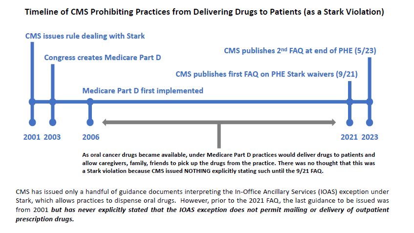 During the COVID-19 public health emergency (PHE), CMS had Stark waivers in place allowing delivery or pick up of drugs. When the PHE ended in May 2023, CMS issued another FAQ stating that the Stark waivers had expired and delivery of drugs to patients was a violation.